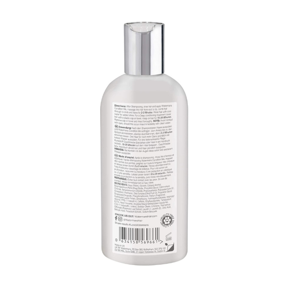 بعد غسل الشعر بالشامبو ، شطف الشعر وتطبيق Watermans Condition Me ، وقم بالتدليك في الشعر من الجذر إلى الحافة ، وتمشيط الشعر حتى