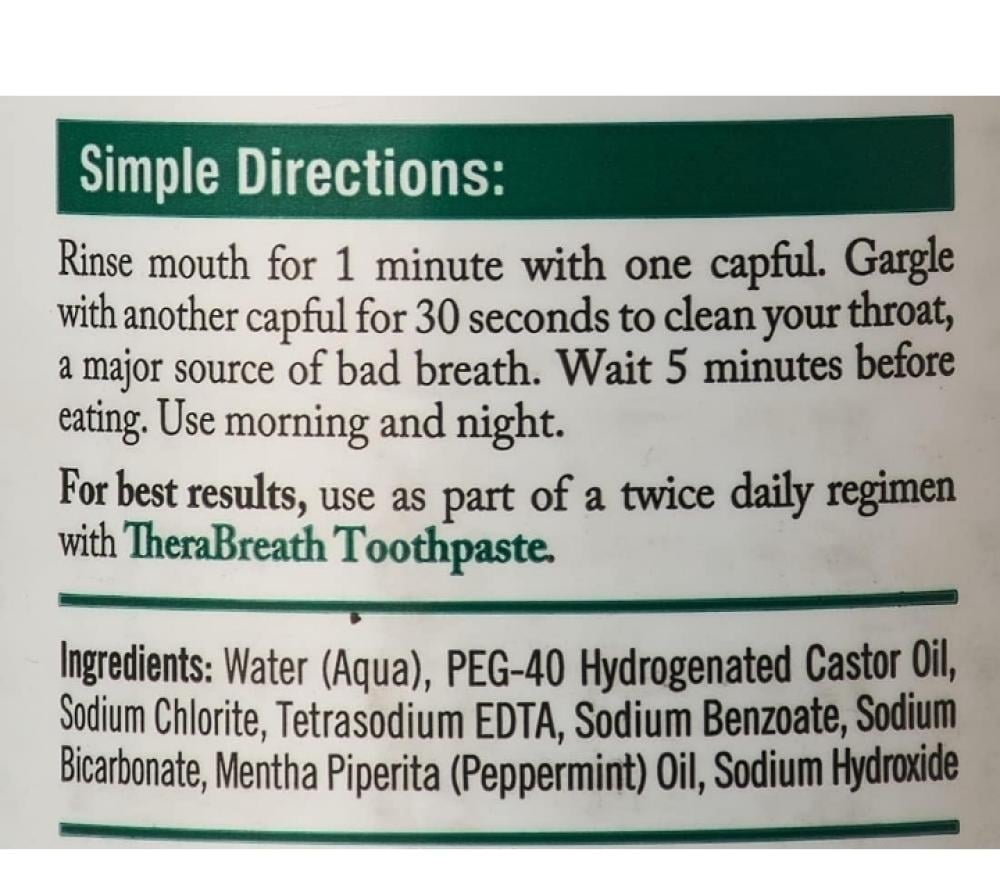 قم بإزالة الغطاء والغلق الواقي، واملأ كوب الجرعات، واشطف الفم لمدة دقيقة واحدة بكوب واحد ممتلئ، ثم غرغرة بكوب آخر ممتلئ لمدة 30 ثانية لتنظيف الحلق، وانتظر 5 دقائق قبل تناول الطعام، وكرر كل 8-12 ساعة، استخدمه كجزء من نظام الأسنان مرتين يوميًا مع معجون الأسنان ثيرابريث.
