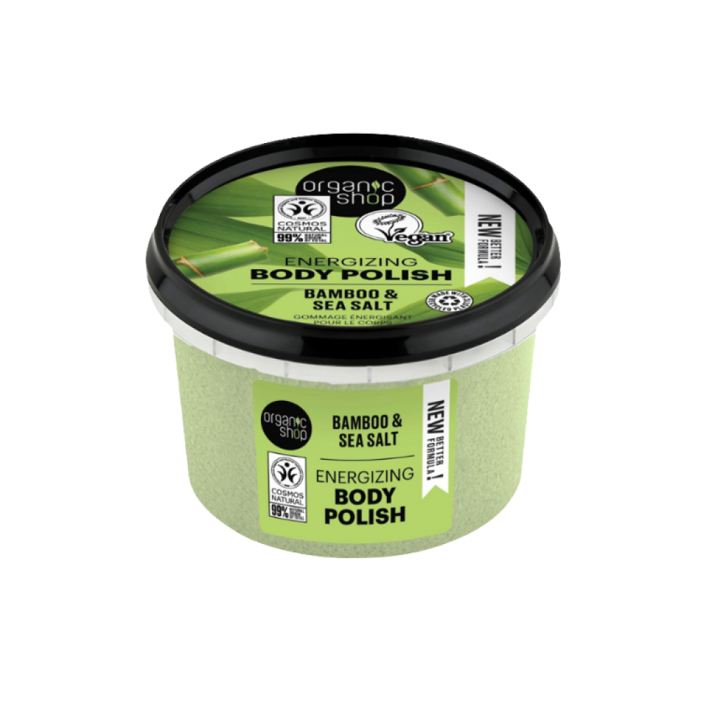 - مقشر الجسم المكون من مستخلص الخيزران العضوي وملح البحر الطبيعي .